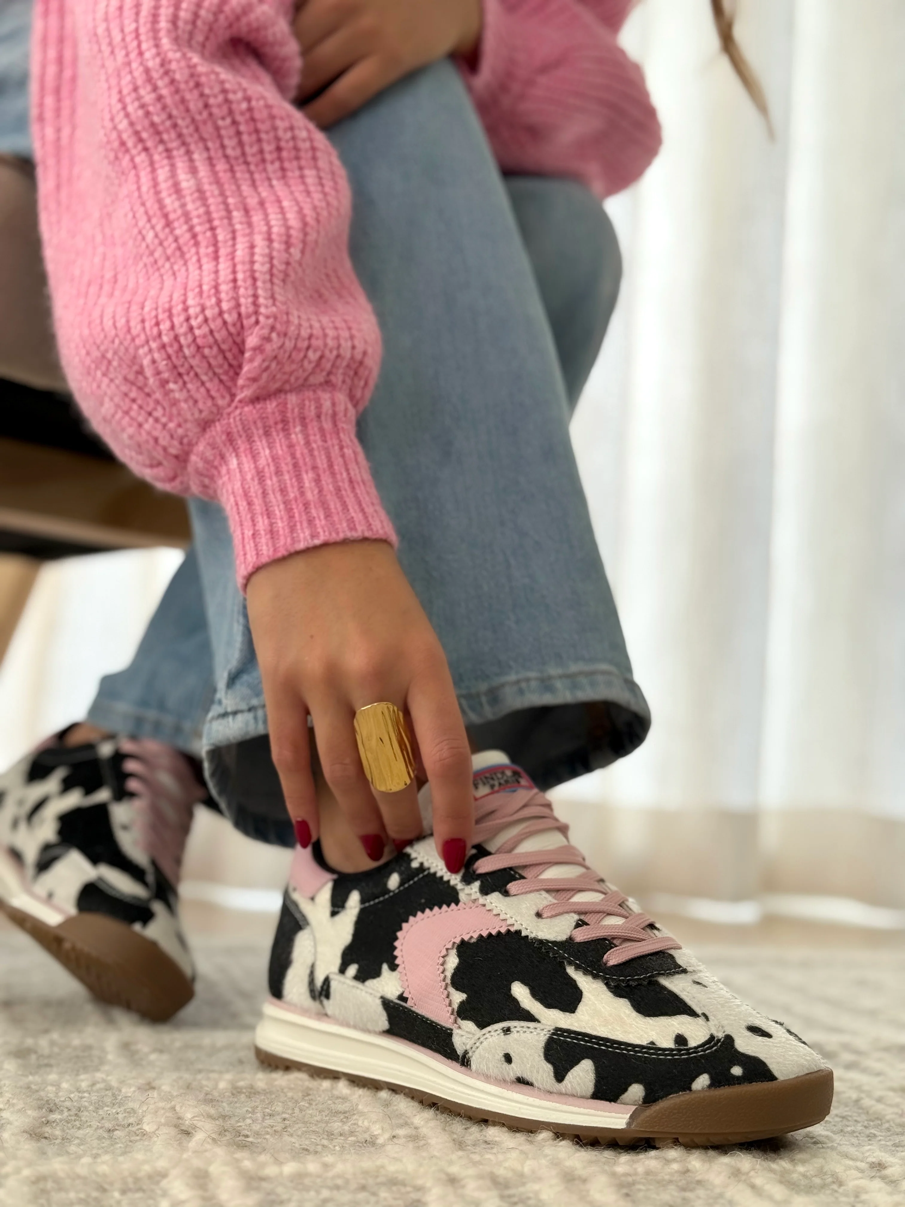 imprimé graphique noir & blanc façon cow, empiècement rose contrastant, lacets assortis